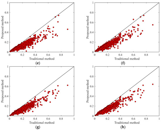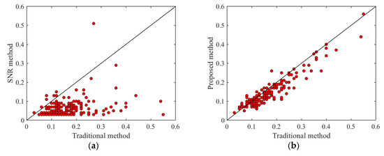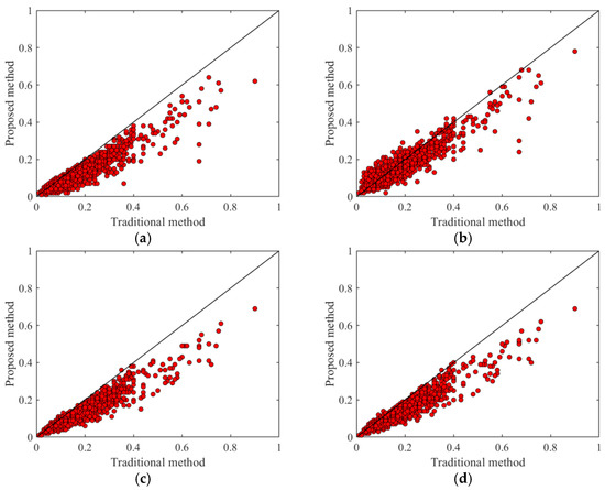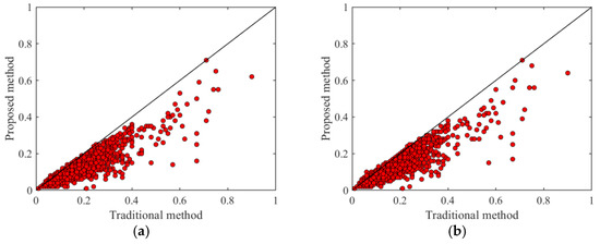 As seen from Figure 8 and Figure 9, almost all of these scatter points were distributed below the black line, indicating that the values obtained using the method in this paper were generally smaller than those obtained using the traditional method, and the unqualified displacement curve was prematurely judged as qualified. The black line here was y = x; if two values were equal, they were distributed on the black line.