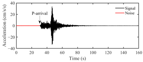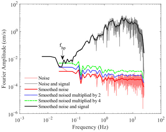 As described in the introduction, the SNR method is widely used in obtaining high-pass cut-off frequencies of strong-motion records [17,23,24,25,26]. This section compares the high-pass cut-off frequencies obtained via the traditional method in this paper with those obtained using the SNR method. The method proposed by Bahrampouri et al. [24] was used to obtain a high pass cut-off frequency, and this paper used an SNR greater than 3. The strong-motion record before the arrival of the P-wave was used as a noise window (Figure 10). The P-wave arrival pickup algorithm proposed by Ma et al. [47] was used here. The FAS of strong-motion records and noise was smoothed (the Konno–Ohmachi method [48]), and the smoothed noise FAS was linearly scaled by 4 times (the green dotted line in Figure 11). The point where the zoomed noise smoothing FAS intersects the ground motion smoothing FAS was considered the high-pass cut-off frequency (indicated by an arrow in Figure 11). The choice of a scaling factor equal to four ((signal + noise)/noise) implied an SNR equal to three as the criterion for the choice of the high-pass cut-off frequency.