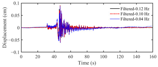 Figure 12 shows the displacement curves for filtering at high-pass cut-off frequencies obtained using the traditional method, the method of this paper, and the SNR method, respectively. For this record, there was a significant drift in the filtered displacement curve using the high-pass cut-off frequency based on the SNR method, indicating that the high-pass cut-off frequency used was inappropriate.