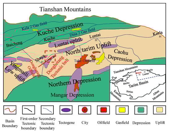 The Donghetang oil field is located in Kuche County, Xinjiang []. Additionally, it is the first marine sandstone oilfield discovered in China that is rich in high-abundance oil and gas, and is highly productive. Its discovery is a significant breakthrough in the theory and practice of oil and gas exploration in China’s marine sandstones []. It has kicked off the exploration of marine sandstones in the Tarim Basin, especially the Donghe Sandstone [,]. The exploration and development of the Donghetang field is of great significance to oil and gas exploration and the development of the Tarim oilfield [].