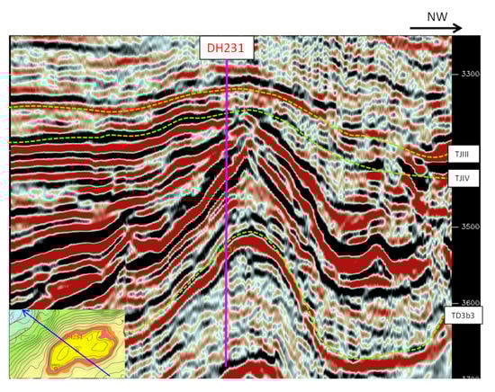 The Donghe 23 trap is located in the Donghetang fault zone on the northwest margin of the Lunnan low salient in the Tarim Basin. The Donghetang fault structural zone is situated in the Tabei uplift (Figure 1). The north is the Kuche oil-bearing sag, and the south is the hydrocarbon generation center of the marine hydrocarbon source rocks in the Mangar sag. Well DH 231 is an appraisal well located in the Donghe 23 trap. To date, only one well has been drilled within the trap. The appraisal well was originally designed to penetrate the JIII formation and to explore the distribution of hydrocarbons in the JIV formation (Figure 2). Reservoir heterogeneity is strong, and local low-permeability reservoirs have developed. The target layer of Well DH231 is generally the oil permeable layer with medium and low porosities.