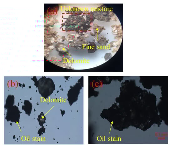 As shown in Figure 4, the wellhead blockage in Well DH 231 was a mixture of organic material and inorganic phases. From the reflected light image (Figure 4a), it can be observed that the wellhead blockage is mainly composed of three parts, namely, dolomite, fine sand, and a mixture that is unidentifiable under reflected light. The unknown mixture is purplish red in color and may be formed in a partially oxidized environment. Dolomite mixed with fine sand can be clearly discernible. Larger oil stains can be identified in polarized light micrographs (Figure 4a,b). The quantitative results show that the oil stains of the blockage could be up to 80%, and inorganic mineral accounts for less than 20% (Table 2). It is presumed that the inorganic phases may be rock fragments or cement in the drilled formation.