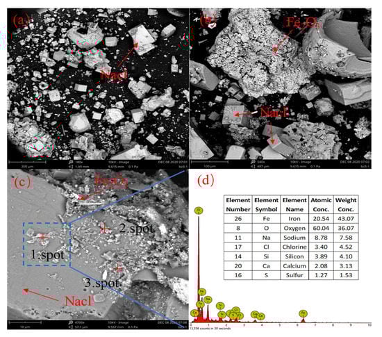 The energy spectrometer performs component analysis by detecting the energy of the characteristic X-rays of the sample. The energy of the characteristic X-rays is a function of the atomic number of the sample. Therefore, by detecting the energy of the characteristic X-rays, the corresponding elements can be identified. As shown in Figure 5c, three points were taken on the cubic crystal as well as on the unknown mineral for elemental determination. The characteristic X-ray yield and energy of light elements with an atomic number lower than that of sodium were low; coupled with factors, such as spectral peak shift and interference, accurate detection results cannot be obtained. Mineral types can be inferred from the morphology, grayscale, point analysis of energy spectrum, and atomic ratio of minerals in SEM images. The energy spectrum identification results show that the unknown minerals mainly comprised four elements: Fe, O, Na, and Cl (Figure 5c,d). The four elements accounted for more than 95% of the total elemental amount. Among them, Fe and O elements accounted for 80%. According to the kα line of element oxygen and iron obtained from the energy spectrum, the atomic ratio of the two elements was calculated to be about 2:3. This suggested that the unknown mineral attached to the surface of the crystal was iron oxide. Undoubtedly, it is impossible to contain a large quantity of iron oxide in the formation []. A plausible explanation is that the iron oxide in the blockage may have come from rust on the metal parts of the inner wall of the wellbore.