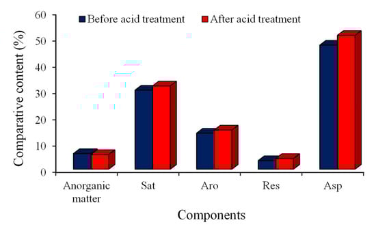 Chloroform bitumen “A” was extracted from the blockage with chloroform using the Soxhlet extraction method [,]. The obtained chloroform pitch “A” was subjected to group components separation. Studies have shown that the main components of the oil stains were saturated hydrocarbons, aromatic hydrocarbons, resins, and asphalt (Figure 6). The percentages of saturated hydrocarbons, aromatic hydrocarbons, resins, and asphaltenes were 30.03, 13.67, 3.22, and 47.18, respectively. Oil stains have the same material composition as normal crude oil or source rock extracts []. It is worth noting that the relative content of asphaltene in oil stains was relatively high, reaching 47.8% (Table 2). The formation of wellhead blockages may be related to the extraction rate of crude oil from the formation. With the continuous extraction of crude oil from the formation, the light and heavy fractions of crude oil are differentiated. Compared to normal crude oil, lighter oil has greater fluidity and a better recovery rate than crude oil. The heavy oil with a high asphaltene content has poor fluidity and is more likely to cause wellhead accumulation. Li et al. (2022) observed that the degree of condensation of asphaltenes in blockage extracts was significantly higher than that of asphaltenes in crude oil, and the asphaltenes contained more naphthene and aromatic ring structures []. This can accelerate the precipitation of other asphaltene components in the crude oil. Wu et al. (2022) further emphasized that the more polar asphaltenes were easier to spontaneously precipitate at the wellhead []. High asphaltene content in the oil stains may be the potential reason for wellhead plugging of Well DH231. In the production of heavy oil with high asphaltene content, the viscosity of crude oil can be changed by adding additives to the crude oil to improve the production efficiency of oil wells and reduce wellhead clogging.
