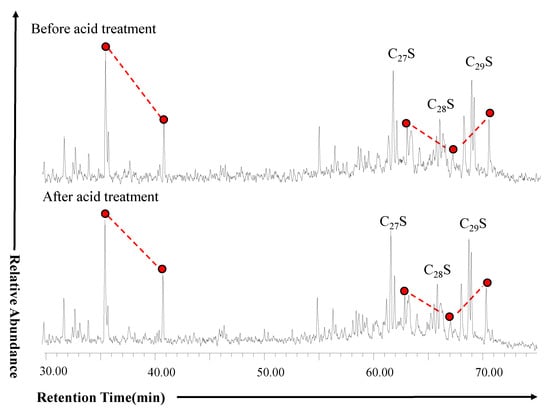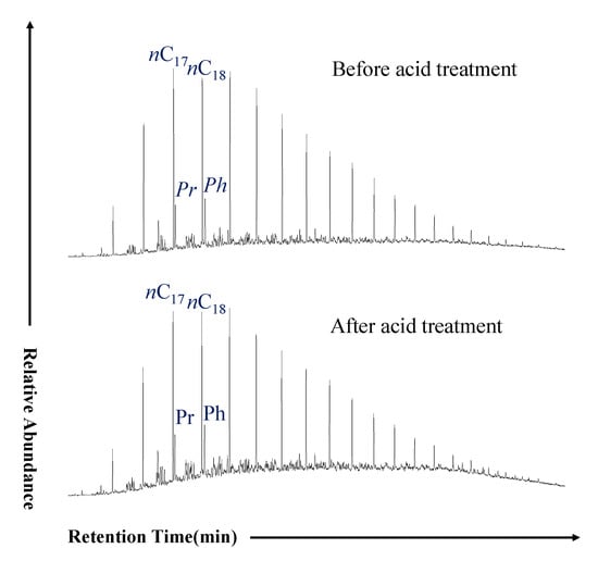 At the same time, the later acidification process had little effect on the overall distribution characteristics of the chromatogram of the wellhead blockage. In Figure 4, the acid-treated blockage exhibited a distinct UCM bump in the baseline of the chromatogram (Figure 7). It is speculated that a small amount of organic matter encapsulated by inorganic minerals is released during blockage acidification []. The secondary release of organic matter was not enough to affect the overall distribution characteristics of primary organic matter in the whole oil chromatogram. However, the complex compounds released can cause significant UCM bulging in the total oil chromatogram []. The distribution characteristics of Pr/Ph, Pr/nC17, and Ph/nC18 in the chromatograms (Figure 4) showed that the Pr/Ph values before and after the acidification of the blockage were close to 0.9, respectively, 0.94 and 0.90 (Figure 7). When the thermal evolution of the source rocks is similar, and the initial source input is relatively stable, Pr/Ph can be used as an indicator of the oxidation conditions of the original depositional environment of the source rocks, indicating the sedimentary paleoenvironment []. Didyk et al. (1978) suggested that Pr/Ph < 1 represented a reducing environment and Pr/Ph > 1 indicated an oxidizing environment []. Peters et al. (2017) pointed out that for samples within the oil-generating window, Pr/Ph > 3 represented the input of terrestrial organic matter in an anoxic environment, while Pr/Ph < 0.8 represented an anoxic, reduced sedimentary environment []. Combined with the comprehensive analysis of the geological background, it is believed that the oil stains of Well DH231 were formed in a strongly reducing marine environment.