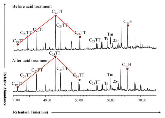 Terpenoids widely exist in source rock extracts and are reliable indicators for characterizing depositional environments []. The abundance of tricyclic terpenes in the blockage was relatively high, with C23 tricyclic terpenes as the main peak (Figure 8) and contained a high content of C28 and C29 tricyclic terpenes. It exhibited typical Middle and Upper Ordovician marine crude oil distribution characteristics []. The hopane series dominated the pentacyclic terpene alkanes, and the moretane series was poorly developed. The C30H/C30M values ranged from 10.05 to 11.05 with a mean of 10.55 (Table 3). The m/z 191 mass chromatograms of the saturated hydrocarbon fractions of the blockage before and after acidification had very similar characteristics, indicating that acidification had little effect on the composition of organic matter (Figure 8). It is easy to observe that it is in good agreement with the RIC diagram characteristics of the compounds in the saturated hydrocarbon fraction before and after acidification in Figure 7.