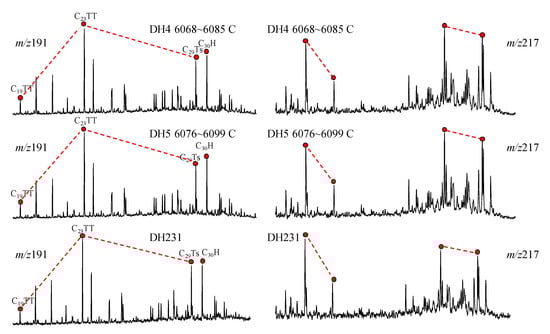 Notably, a certain abundance of 25-norhorpanes series compounds (25- in Figure 5) and 25,28-bis-norhopanes (peak after Tm) were faintly visible on the m/z 191 mass chromatogram (Figure 8). Due to the n-alkanes in the blockage being preserved and intact (Figure 7), the appearance of 25-norhopanes and 25, 28-bis-norhopanes indicated that Well DH231 had undergone more than two oil and gas charging phases [,]. The pre-charged crude oil of Well DH231 underwent sufficient biodegradation, and the n-alkanes in the blockage were the products of late crude oil charging.