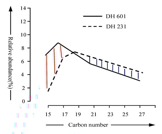 However, compared to the saturated hydrocarbons of crude oil in Well DH601, there was a significant reduction in the light component of the oil stains (Figure 12). The relative content of nC15 in the oil stain can be more than 5% lower than that of the crude oil from Well DH601. At the same time, the content of heavy components in the oil stains showed a significant increase again (Figure 12). In summary, the oil stains at the wellhead of Well DH231 may come from the same reservoir system as the crude oil of Wells DH 4 and DH5. The oil stains in the blockage were the migration products of the crude oil in Wells DH 4 and DH5 [].