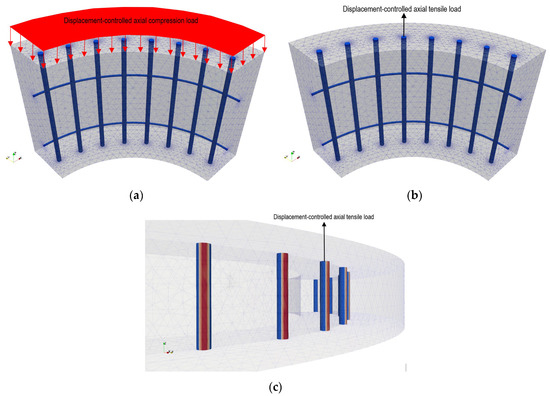 In the first analysis case (Case 1), concrete was subjected to a displacement-controlled axial compression load to assess the impacts of corrosion on the deterioration of the compressive strength of concrete. In order to determine the stress–strain relationships between the corroded cover and core concrete, the compression load was uniformly applied in an increment of 0.01 mm in 100 steps to the top edge of the model (Figure 5a).