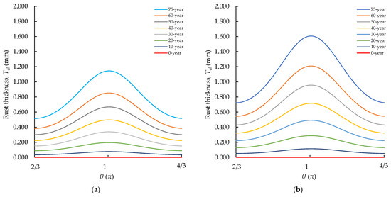This study employed a nonuniform rust distribution which is expressed in terms of the rust thickness []. The rust thickness is calculated as [21]:
