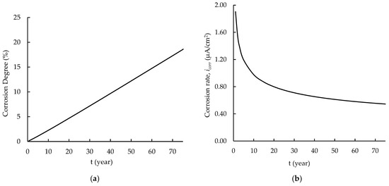 Figure 7 illustrates the PC-bar’s corrosion degree and corrosion rate over time. After 75 years, the corrosion degree reached 18.56%. The corrosion rate was found to decrease exponentially over time. A year after the beginning of the corrosion propagation, the corrosion rate was 1.9033 μA/cm2, and it had decreased to 0.5442 μA/cm2 at 75 years later.