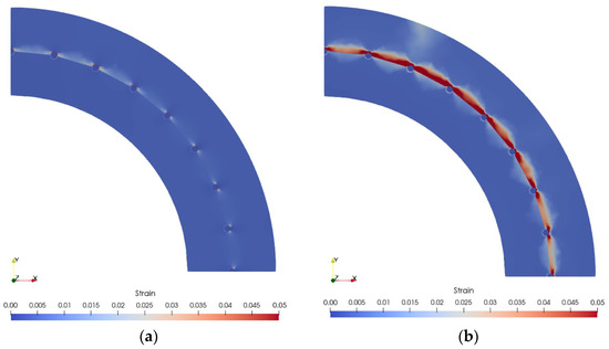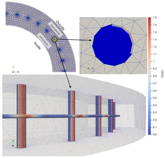 Figure 8 shows volumetric strain expansion in the model representing the 75-year rust expansion. The maximum strain expansions of the PC-bar and transverse rebar in the 75 years were 1.1448 mm and 1.6061 mm, respectively.