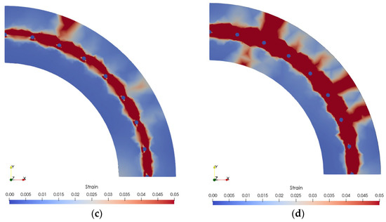 Figure 9 illustrates the principal strain distribution under the peak axial stress of corroded concrete. At a 9.67% corrosion degree, the concrete strain exceeded 0.03, and along with the interconnection of the PC-bar position, the cover concrete was predicted to start spalling. The cover concrete had spalled at a 14.74% corrosion degree, triggering cracking in other locations. More regions were cracked and spalled at an 18.56% corrosion degree. Rust expansion caused cracks around corroded PC-bars as the degree of corrosion increased. The cracks became interconnected over time, resulting in the cover concrete spalling. Moreover, the cracks caused a decrease in the compressive strength of concrete and bond strength.