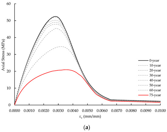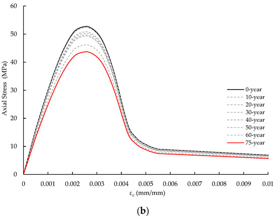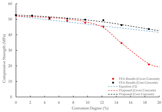 Figure 12 illustrates the relationship between the corrosion degree and the concrete compressive strength. The compressive strengths of the core and cover concrete were obtained by taking the ultimate axial stress values referred to in Figure 10. When the corrosion degree reached 18.56% (75 years), the compressive strength of core concrete decreased to 82.87% of its initial value, continuously dropping with the corrosion degree. The compressive strength of the cover concrete also gradually decreased with the increase in the corrosion degree in the range of the corrosion degree 11.50% or less. In contrast to the core concrete, after the corrosion degree reached 11.50%, the compressive strength of the cover concrete significantly dropped. When the corrosion degree reached 18.56%, the compressive strength of the cover concrete was 40.21% of its initial value.