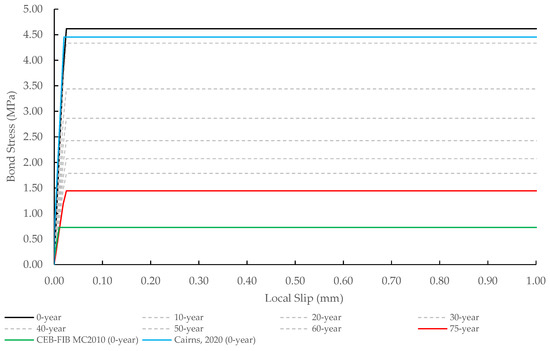 Figure 13 illustrates the local bond–slip relationship for the PC-bars. The black line is the bond–slip without corrosion (0 years), while the red line represents the bond–slip at 75 years. The dotted lines between these two solid lines show the bond–slip relationship corresponding to points in time from 10 years to 60 years. In the case without corrosion, the PC-bar began to slip when the bond stress reached 4.62 MPa. At 75 years, the bond stress decreased to 31.3% of the initial value due to cracks around the corroded PC-bar and concrete. Figure 13 also depicts the bond–slip relationship by using FIB Model Code 2010 [38] and Cairns [39]. The bond strength by using Cairns was similar to that of this study; however, Cairns did not examine the bond strength reduction with the progress of the corroding of the rebar. Furthermore, the bond strength by using the FIB Model Code 2010 was very conservative compared to the results of this study. The explanation is that the FIB Model Code 2010 equation was derived from the average value of their test results for various compressive strengths of standard concrete, rebar diameters, and anchorage depths.