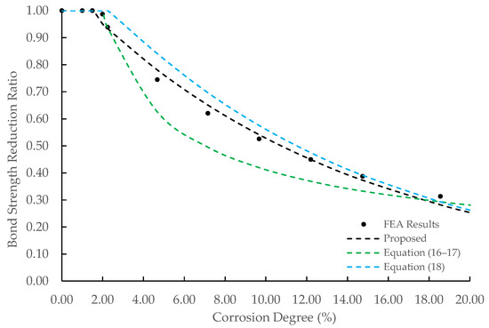 - The bond strength was reduced inverse-exponentially against the corrosion degree due to cracks in the concrete around the corroded rebar. The proposed equation could predict the bond strength decrease precisely, while the equations proposed by previous studies overestimated or underestimated the FEA results.