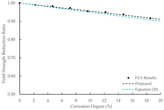 The yield strength reduction ratio decreased linearly against the corrosion degree, which was in line with the result by Du et al. The high degree of fit of Equation (19) to the FEA results was indicated by a determination coefficient (R2) value of 0.987.