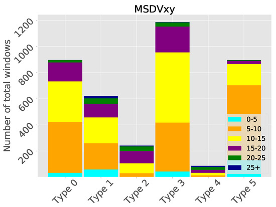 After observing the complete compiled data, with the objective of having a similar driving pattern group, a single road type was selected. Of all possibilities, the main priority was to select the type of road with the greatest variety of motion sickness values. To do this, the data were separated into road types and categorized with colors to express different motion sickness levels (MSDVxy). The obtained results are shown in Figure 4. The Y-axis represents the windows that belong to different comfort levels within each type of road.