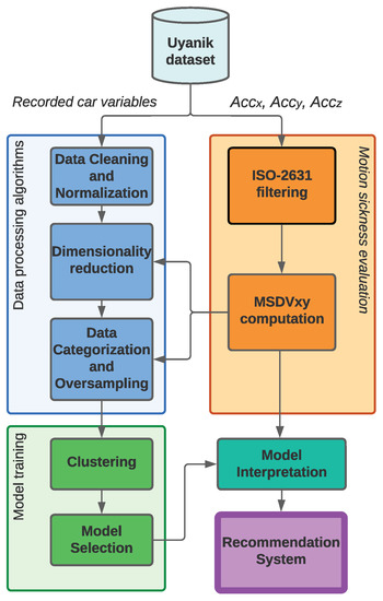 The Uyanik database presented in Section 3 is used as the starting point. On the one hand, in the motion sickness evaluation step, accelerations are used to calculate the MSDVxy variable as explained in Section 2 in order to evaluate passenger motion sickness. On the other hand, all recorded data variables are processed in the data cleaning and normalization step, where outliers are analyzed and eliminated, and signals are normalized. Next, in order to select the most relevant variables of the dataset from a comfort perspective, in the dimensionality reduction step, different ways to do it are studied and implemented. In the data categorization and oversampling step, the MSDVxy value is used to categorize samples in different levels of motion sickness. Those categories will be used to augment the data by utilizing different oversampling methods, which will return a database that is uniformly distributed over motion sickness. Those four steps will output a database perfectly suited for model training. The objective of the clustering step is to find interpretable cluster systems that represent different driving patterns, so, the selected normalized and categorized variables of the previous steps are used to train clustering algorithms. Different clustering algorithms were ’tried’ to assess the differences and the quality of the obtained results. From the obtained results, in the model selection, the best solutions will be chosen in order to understand them from a motion sickness perspective in the named Model interpretation step. Finally, the analysis of the obtained driving patterns will be the basis for the proposed recommendation system.