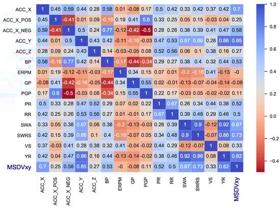 Concerning dimensionality reduction, first, the Pearson coefficient for correlation analysis was analyzed. In Figure 6, all variables presented in Section 3, are compared to the motion sickness criteria: MSDVxy. Secondly, recursive feature elimination (RFE) with a random forest regressor was applied to all variables until five variables were left. The results of both methods are summarized in Table 1.