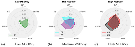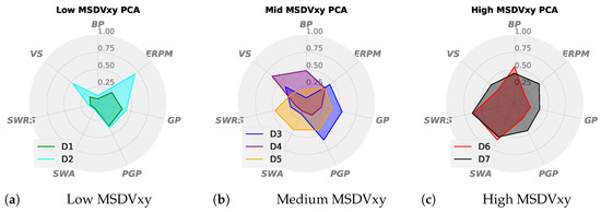 While the cluster numbers are higher than in the previous Section 6.1, many of the generated structures from the previous solution also appear here. The worst clusters, red (C4 and D6) and black (C6 and D7), are very similar in both models sharing high BP, SWA, SRWS, and medium speeds. The C3 cluster of Solution 1 is very similar to the D5 of Solution 2 with medium-high SWA, SWRS, ERPM, GP, and PGP. The C2 cluster of Solution 1 is also similar to the D4 cluster of Solution 2, obtaining the characteristically high BP, VS, and little of everything else. The most comfortable cluster of Solution 1, C1 (Figure 7), also seems to be a mixture of the comfortable D1 and D2 clusters of Figure 8 with D1 obtaining the lower end of ERPM and VS, and D2 obtaining the higher end of these variables.