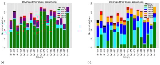 Many of these conclusions are applicable if we use the solution obtained by applying RFE (Figure 9a); however, since the models are different, some patterns are not completely represented and making direct links between the two models can be indicative but not decisive. Drivers that have the lowest amounts of C1 windows, also have low D1 and D2 cluster memberships. The only notable exception seems to be IM1051, which has 80% of C1 windows but only a small number of windows are in D1. We can safely say that both models have categorized the low MSDVxy samples of each driver in different yet similar ways. Concerning clusters related to high steering wheel usage of the PCA model (D5, D6, and D7) and RFE variables (C3, C4, C5), it seems that D5 is perfectly represented in the C3 cluster in driving style distribution. With C4 and C5, direct comparisons are not as useful since the error of a small number of windows could completely change our evaluation, but we can observe how all five drivers with no C4 and C5 clusters do not have D6 or D7 (except IM1086, which has a low D6).