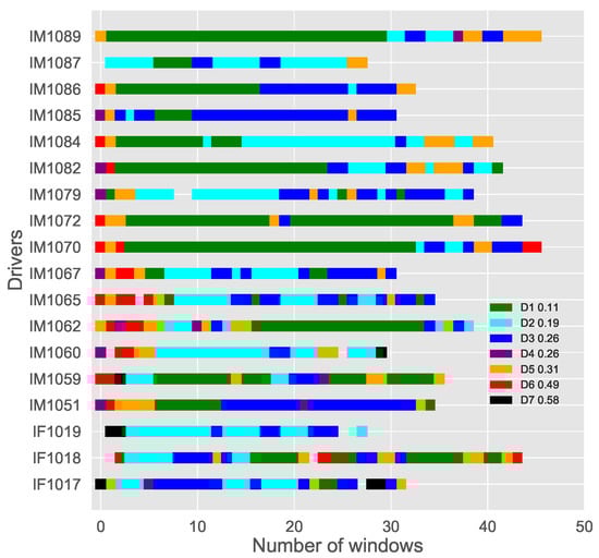 By comparing the clusters and recommendations summarized in Table 8 with Figure 10, we can observe the path of all drivers. The first direct conclusion is that, as observed in our previous work [34], the route features play a key part in passenger comfort. Data support that the route has a rough start, with many of the D5, D6, and D7 windows located at the start. Moreover, while high-risk windows are located in the same parts, the number of windows, an indicator of the intensity of the pattern, can be clearly discerned. Thus, drivers, such as IM1067, IM1065, IM1062, and IM1051, exhibit at least four medium/high-risk windows. Driver IM1089 only has one D5 window before moving into a continuous D1 assignment.