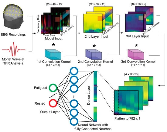 On this premise, artificial intelligence (AI) has become a powerful tool, with deep learning (DL) designs delivering automatic feature detection and extraction, unleashing outstanding advances in classification, segmentation, and prediction tasks. As such, many in fatigue detection studies have utilized DL algorithms due to their high classification performance (compared to conventional machine learning methods), especially when utilizing solely EEG signals (disregarding other modalities, such as electrooculograms or facial video data) [10,11]. Furthermore, in pursuit of metrics with high discriminative power, even more complex architectures have been proposed in literature, with convolutional layers and recursive neural networks achieving promising results, however at the cost of increasing complexity [12]. In this regard, most of these implementations use multi-layered deep convolutional neural networks (CNNs) that require high-end hardware and a substantial amount of time for both training and prediction phases. Although, such configurations usually attain high classification accuracy, the overall computational cost deems them inapplicable for real-world application (e.g., brain-computer interfaces), since minimal computational resources and prediction time are essential in order to achieve real-time functionality.