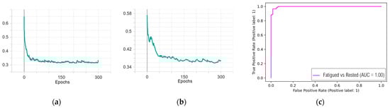 The computing resources employed for training the aforementioned model consist of an Intel (R) Core (TM) i7-9700 CPU with 3.00 GHz and 16 GB of 2667 MHz RAM on a Windows 11 Pro OS Version 22H2 (Microsoft, Redmond, Washington, U.S.). No CUDA compatible GPU was utilized, so the AI training was conducted completely on the CPU. The created feature dataset consists of 2401 trials: 1234 samples for the Fatigued class and 1167 for the Rested class. Even though all subjects completed the same number of tasks for each state, only correct responses were considered for the creation of the dataset, introducing a minor class imbalance. However, the differences were negligible and, henceforth, it cannot be suggested that they contributed to the corresponding bias. To train the designed deep learning model, a combined-subject training strategy was employed in order to exploit features that provide generalized (subject independent) information on mental fatigue. As such, all the observations of Fatigued and Rested data points of all the subjects were combined and randomly partitioned into the three data subsets; i.e., the training, the validation and the test subsets. In detail, the full dataset was split into a training subset (containing 75% of the full dataset; 925 samples of Fatigued class and 875 of Rested class), a validation set (containing 15% of the full dataset; 185 of Fatigued class and 175 of Rested) and a test set (containing 10% of the full dataset; 124 of Fatigued class and 117 of Rested). Assignment was performed randomly to avoid any selection bias among participants. The neural network model was trained repeatedly using the training dataset for a specific number of epochs. Each epoch (which is a hyperparameter of the training process) is a complete pass of the entire training dataset from the learning algorithm. This is required for a model until the learning process converges. Usually, the number of epochs is in hundreds or thousands. However, our model converged in almost 150 epochs.
