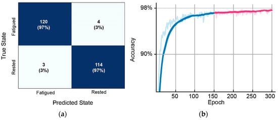 (a) Proposed model confusion matrix; (b) validation curve for 150 epochs (blue) and 300 epochs (magenta). Darker colors represent a smoother curve.