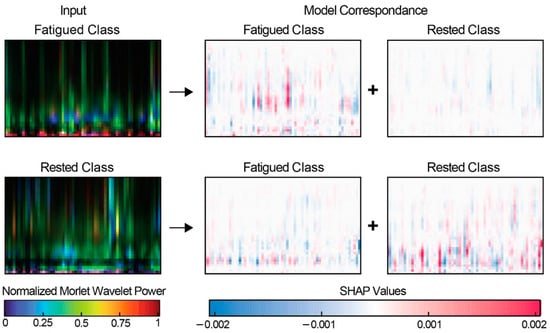 A paradigm of SHAP values representation. The inputs denote the TFR matrices, while the model correspondence reflects the effects of the colored regions in each specific class output. The upper row corresponds to the Fatigued class, while the lower row to the Rested class.