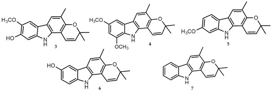 Several studies show the antiviral property of plant-derived molecules against RNA viruses [80]. Some of these, such as carbazole alkaloids from Murraya koenigii have been evaluated for SARS-CoV-2 infection. Murraya koenigii, known as the “Curry leaf tree” is a plant very widespread and of considerable pharmaceutical interest due to its numerous beneficial activities (antioxidant, antidiabetic, anticancer, anti-inflammatory, hepatoprotective, nephroprotective, cardioprotective, neuroprotective and antimicrobial, and antiviral activities). These activities are mainly due to the presence of compounds with a carbazole structure in its leaves, roots, and bark [81,82]. For such evidence, Wadanambi et al. in 2022 [53] evaluated the inhibitory potential of carbazole alkaloids from Murraya koenigii against Mpro by computational study. Using 3WL (5,6,7-trihydroxy-2-phenyl-4H-chromen-4-one) as a reference inhibitor, five carbazole alkaloids 3–7 (Figure 3) (koenigicine (8-methoxy-3,3,5-trimethyl-11H-pyrano[3,2-a]carbazol-9-ol) (3), mukonicine (9,11-dimethoxy-3,3,5-trimethyl-11H-pyrano[3,2-a]carbazole) (4), O-methylmurrayamine A (9-methoxy-3,3,5-trimethyl-11H-pyrano[3,2-a]carbazole) (5), koenine (3,3,5-trimethyl-11H-pyrano[3,2-a]carbazol-8-ol) (6), and girinimbine (3,11-dihydro-3,3,5-trimethyl-pyrano[3,2-a]carbazole) (7) displayed interactions in the active site of SARS-CoV-2 Mpro.