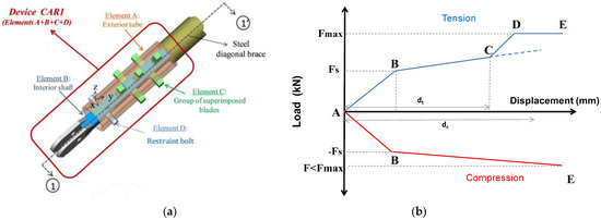 (a) Damper CAR1; (b) Non-linear behavior of the diagonal steel brace with CAR1 [18].