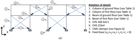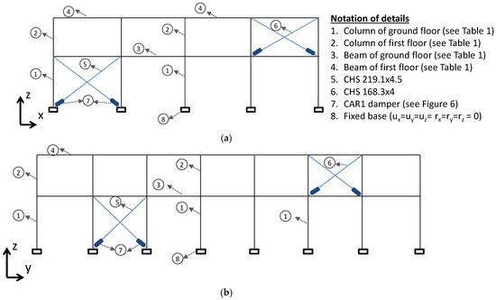 Based on the work of Papadopoulos [26], the behavior of a structure with a random topology of steel diagonal braces is better in terms of floor displacement, inter-story displacement, and the distribution of bending moments and shear loads. Therefore, the placement of the steel diagonal braces in this study (both for RD1 and RD2) is random. However, we placed importance on ensuring that the dampers and the steel diagonal braces are located in a configuration that does not introduce eccentricity into the structure [27]. For redesign solution RD1, steel diagonal braces with X shape have been selected for only one frame in each direction and on each side of the building’s center of mass for the two stories (see Figure 4). As expected, on the ground floor, greater reinforcement is required compared with the first floor. Cross-sections of the diagonal steel bars were selected based on the available cross-sections on the market in order to obtain the required force, so the steel circular hollow diagonal braces of larger diameters were placed in these locations (CHS 219.1 × 4.5 on the ground floor and CHS 168.3 × 4 on the first floor).
