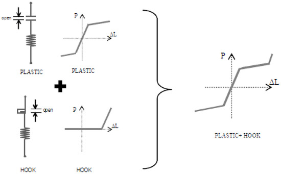 Pushover analyses have been conducted of redesign solution RD1 by taking into account (i) the existence of the steel diagonal braces and (ii) the existence of CAR1 in the steel diagonal braces. In every strengthening frame, two CAR1 dampers were positioned, with one of them working under compression and the other one working under tension (Figure 5). CAR1 dampers were modeled with two parallel N-link elements: Plastic, which simulates the behavior of the group of superimposed blades, and Hook, which simulates the existence of the restraining bolt (Figure 6). The behavior of the plastic element modeled by the stiffness and the yield strength witch results from a slight reduction in the maximum load that the compressive steel braces can carry out (see Table 2 and Table 3). For the Hook element, the most important parameters is the opening of the gap (see Section 4). The properties of each CAR1 damper have been selected based on previous experimental and numerical results [21] in such a way that the dampers are able to protect the steel diagonal braces from premature buckling (see Section 4) by controlling the maximum axial load of the diagonal steel braces using an appropriate selection of the number and dimensions of the superimposed blades and their elastoplastic properties.