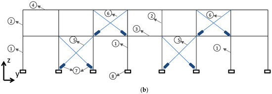 During an earthquake, the seismic energy introduced into a building leads to the creation of plastic deformations, hinges, and cracks [1]. Passive energy dissipation dampers have widely been used in recent years to reduce the dynamic response of civil engineering structures subjected to seismic loads. One of their advantages is easy replacement and repair, and they are effective because they minimize structural damage by absorbing structural vibrational energy and dissipating energy through their hysteresis behavior. More generally, they can be categorized into dampers that depend on displacement, dampers that depend on speed, and dampers with a combination of the two. The types of dampers that dissipate energy in construction include metallic dampers, friction dampers, viscous or viscoelastic dampers, self-centering dampers, and tuned mass dampers [2,3,4,5,6]. Other researchers focused their study in seismic-resistant steel framing system capable of providing stiffness and ductility to new or existing structures [7,8], or the use of buckling-restrained braces [9,10].