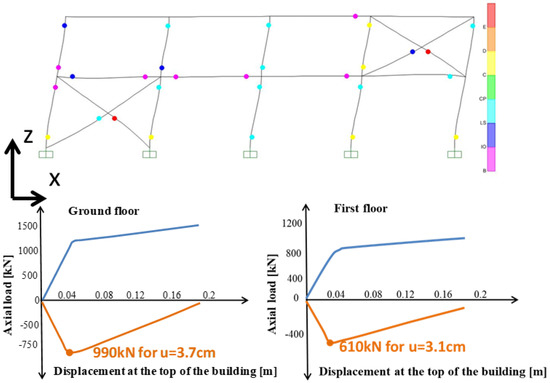 Figure 10 shows the plastic hinges of the RD1 building without the installation of CAR1 dampers for the displacement level of 18.4 cm at the top of the building, and it shows the axial load–displacement curves for the steel diagonal braces of the ground and first floor. It is noticed that the steel diagonal braces were buckling under compression, their most common problem [28,29,30], equal to 990 kN for the brace of the ground floor with a displacement of 3.7 cm at the top of the building (drift = 0.4%) and 610 kN for the brace of the first floor with a displacement of 3.1 cm at the top of the building (drift = 0.38%).