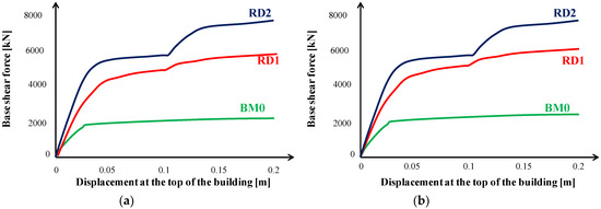 Figure 11 compares the pushover curves of all buildings (BM0, RD1 with CAR1 and RD2 with CAR1) in the x-x direction and in the y-y direction. It is noticed that the RD1 building is able to take a 149.2% (6080 kN) and 135.6% (5960 kN) higher base shear load in the x-x and y-y directions, respectively, and the RD2 building is able to take a 212.3% (7620 kN) and 198.8% (7560 kN) larger base shear load in the x-x and y-y directions, respectively, for the same level of displacement (drift = 2%).