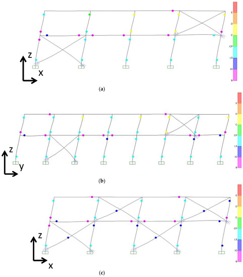Figure 12 presents the plastic hinges of RD1 and RD2 for a horizontal displacement at the top of the building of 18.4 cm in both directions. The hinges of the columns remain in the Life Safety (LS) performance level in both buildings and in both directions, so the buildings have not suffered substantial damage as a result of this horizontal displacement (Figure 12a–d). In addition, with the installation of the CAR1 dampers the buckling of the steel diagonal braces was prevented (Figure 13).
