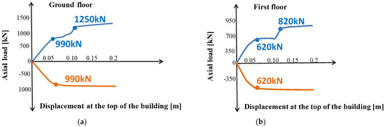 Axial load–displacement curves for the steel diagonal braces of RD1 in x-x direction: (a) ground floor and (b) first floor.