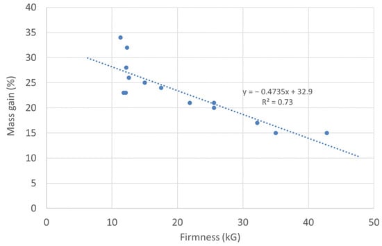 VI considerably increases the mass transfer between the product and the surrounding liquid. The amount of solution incorporated into the tissue depends on many factors, such as the working pressure, the time of the process, the composition of the solution, and the characteristics of the tissue [6,9]. The VI process carried out at 15 kPa absolute pressure resulted in the mass gain of the sample in the range of 15 to 34% (Table 1). A connection between initial firmness and the amount of solution incorporated into the tissue could also be found. Apple cultivars with hard firmness resulted in a low mass gain (Gala Must, Ligol, and Red Jonaprince mass gain were from 15 to 17%), while lower firmness value responded to higher mass gain. In Figure 1 relationship between mass gain and initial firmness of apple tissue was plotted. It was found that the mass gain was negatively correlated with fresh apple firmness (r = −0.85).