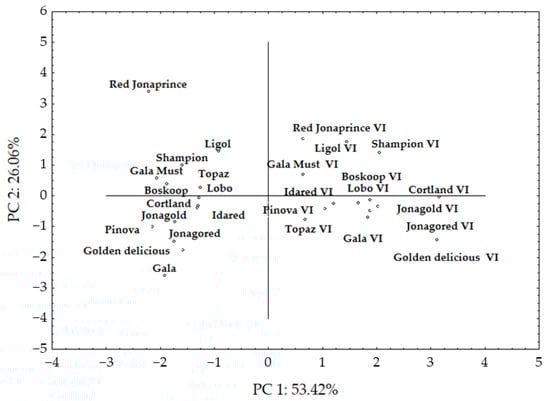 Apple trees (Malus domestica) are cultivated throughout the world, and apples are the second fruit crop in the world. The largest apple producers are China, the United States, Turkey, and Poland [1]. Apples are popularly consumed fresh, but also as processed products. For instance, juices, nectars, chips, snacks, or applesauce are appreciated by customers. A very popular form is minimally processed apples, in the form of cubes, which could be in demand by the bakery and confectionary industry. Apples are also important from a nutritional point of view. They are a rich source of monosaccharides, minerals, dietary fiber, and phenolic compounds [2,3,4,5]. The enrichment of the raw material with active ingredients can be achieved, among others, by applying the vacuum impregnation (VI) technique. Incorporation of a suitable composed solution into apple tissue could enhance both sensory and nutritional characteristics [6,7,8,9]. The main cultivars produced in the European country are Golden Delicious, Gala, Idared, Jonagold, and Jonagored [10]. Different apple cultivars represent different technological properties. It is very important to select and identify cultivars and their properties that predispose them to a specific processing method.