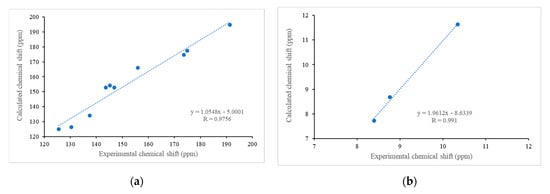 The linear regression between the experimental and calculated (a) 13C NMR; (b) 1H NMR chemical shift of compound 3.