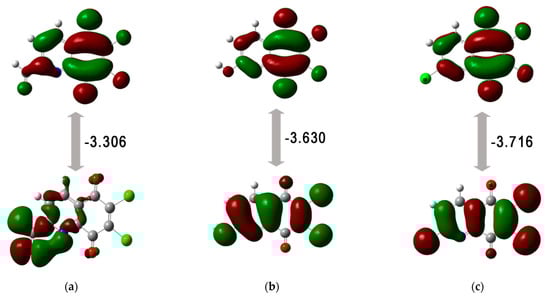 The distribution of the electrophilic and nucleophilic regions in the molecule is described by the MEP map [,]. Different colors on the MEP map represent the different charges. The red, blue, and green regions are negative, positive, or neutral, respectively, []. As seen in Figure 4, the negative areas are localized near the oxygen and nitrogen atoms. The positively charged region is localized near the hydrogen atom at the 5,8-quinolinedione moiety, and the neutral regions are visible near the chlorine atoms.