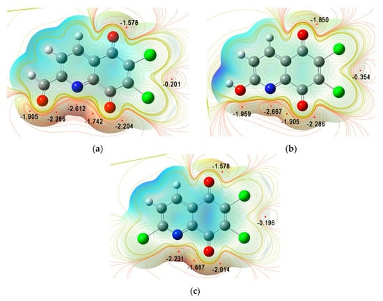 For all compounds, the three main areas of negative electrostatic potential are observed. The first area includes the substituent at the C2 position, nitrogen atom, and formyl group at the C8 position. In this area, the type of substituent significantly influences an electrostatic potential. According to the literature [], for 6,7-dichloro-2-methylo-5,8-quinolinedione 2, three potential minima near the nitrogen atom and oxygen of the formyl group at the C8 position were observed. Replacing the methyl group by the chlorine atom does not affect the arrangement of the electrostatic potential. The introduction of a substituent with an oxygen atom, such as hydroxyl (6) and formyl (3) groups, led to an additional local potential minimum near the substituent at the C2 position. For molecule 3, two local potential minima are observed, both near the formyl group at the C2 position, and they are equal to −1.905 and −2.286 eV, respectively. For compound 6, the potential minimum is located near the hydroxyl group reaching a value of −1.959 eV. The second and third areas for all molecules include the formyl group at the C5 position and chlorine atoms at the C6 and C7 positions, respectively. The electrostatic potentials in these two areas do not depend on the type of group at the C2 position.