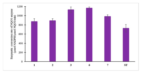 Compounds 1–3, 6–7, and streptonigrin (ST) were tested as a substrate for the NQO1 according to the literature methods [,,]. Results are presented in Figure 5.