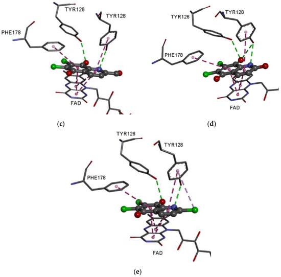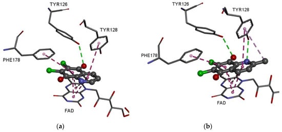 6,7-Dichloro-5,8-quinolinedione 1 creates the hydrogen bond between the formyl group at the C8 position and tyrosine (TYR126) as well as hydrophobic interactions with phenylalanine (PHE178), tyrosine (TYR128), and the FAD cofactor. Molecules with a substituent at the C2 position (2–3 and 6–7) create also the hydrogen bond between nitrogen atom and tyrosine (TYR126). Additionally, in the complex of 6,7-dichloro-2-hydroxy-5,8-quinolinedione 6 with NQO1, a hydrogen bond is observed between the formyl group at the C8 position and tyrosine (TYR126).