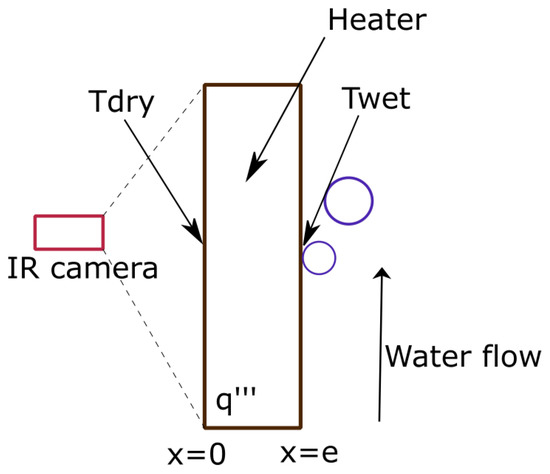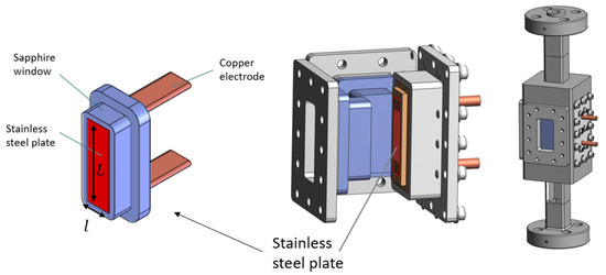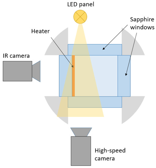 To achieve this goal, it is worth mentioning the work of Richenderfer et al. [6], who designed an experimental setup that allows measurements of each parameter mentioned above (bubble diameter , bubble detachment frequency f, and nucleation site density ). This setup is made of a test section (square cross-sectional) equipped with quartz windows to obtain optical access to the flow. The heater (where nucleate boiling occurs, see Figure 2) is made of a sapphire plate (substrate) coated with a thin layer of indium-tin oxide (ITO). The thickness of this ITO coating is 0.7 µm and is heated by the direct Joule effect.