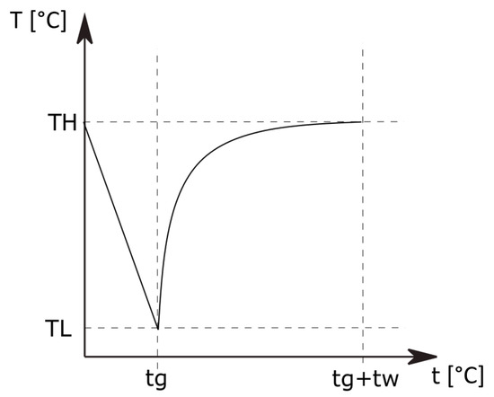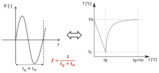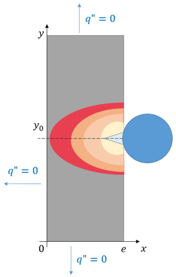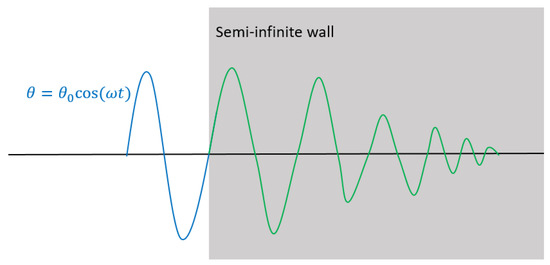 As the first approach, a harmonic time-dependent temperature was applied on the boundary of a semi-infinite wall (see Figure 8) with the following thermal Equations (6)–(9).