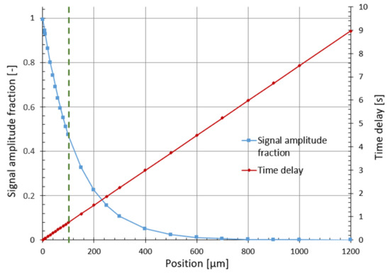 Figure 10 shows the evolution of the bandwidth (blue curve) and time delay (red curve) within the plate as a function of the thickness. It indicates that after 100 µm (green vertical limit) the information is not correctly detectable according to the blue curve: an attenuation by a factor of 2 is noted. This is the first limit that can be fixed for the thickness of the plate. Moreover, the time delay is almost 0.75 s for a 100 µm thickness.